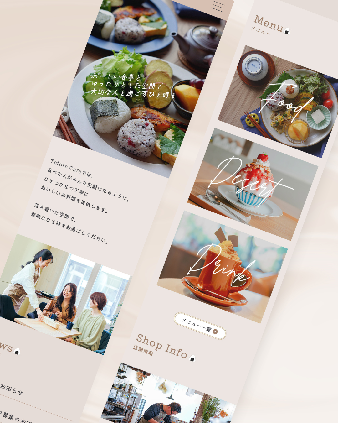 「メニュー」「お知らせ」「店舗情報」など、知りたい情報にすぐアクセスできるシンプルで見やすいサイト構成にしています。写真を多く使用することで訪れたくなるワクワク感と実用性の両立を意識しました。